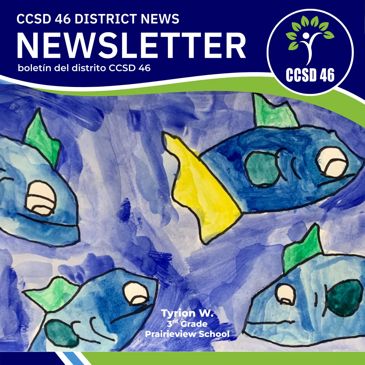 Nos complace presentarles la última edición de nuestro boletín electrónico del distrito. Durante el año escolar, cada nueva edición se publica a nuestra comunidad familiar a través de ParentSquare. El boletín también se publica aquí en nuestro sitio web (d46.org/news/). Estarán llenos de noticias y actualizaciones de varios departamentos, y están destinados a mantener a nuestras familias y la comunidad al día sobre lo que está sucediendo en nuestro distrito escolar.